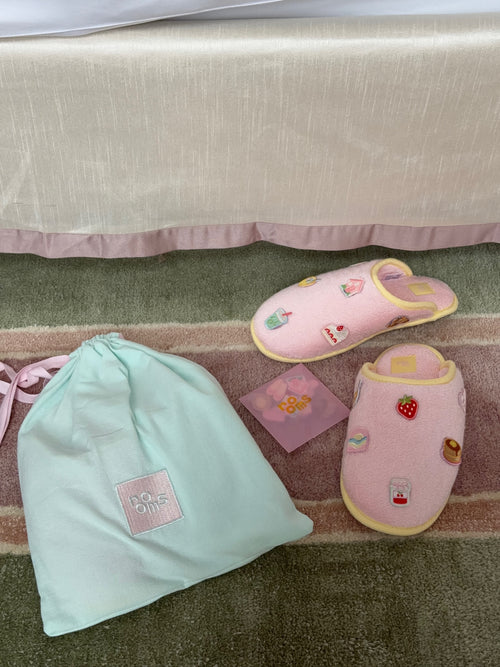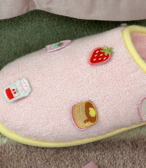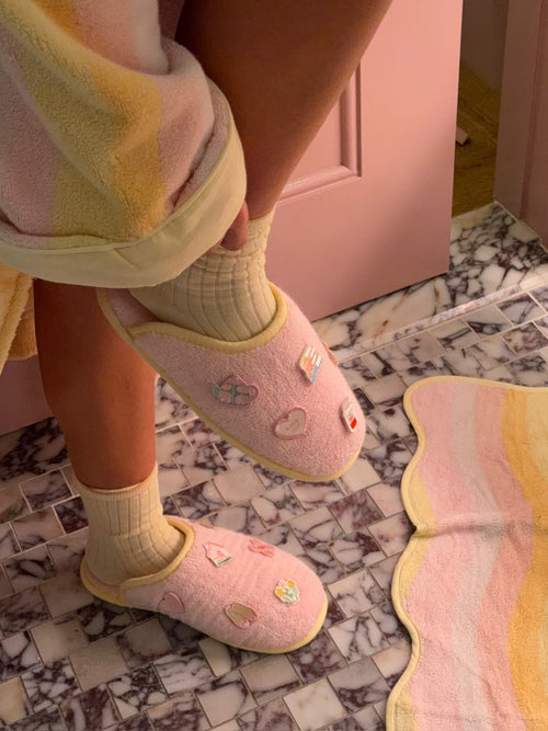 who said comfort had to be boring? let yourself slip into softness with our soft step slippers. developed in a peony plush terry toweling pink fabric and embellished with yellow contrast piping - they are the perfect hug at the end of a long day, finished with rooms hand designed charms for a touch of lighthearted style. so, swap the charms, mix the colours and feet up!
