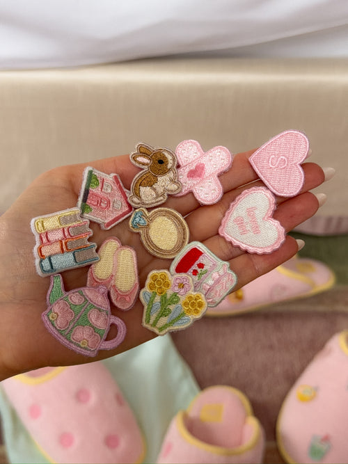 the slippers will arrive with velcro patch covers and your 12 selected patches in a room branded envelope for you to position and personalise as you please.